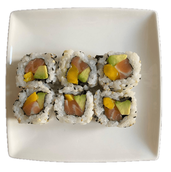 Saumon, avocat et mangue dans un roulé croustillant de graines de sésame.