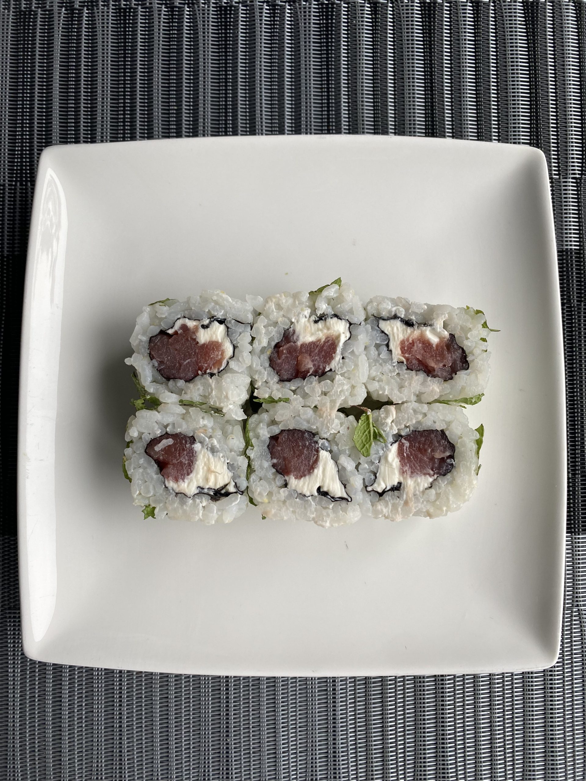 Rouleaux de riz inversés avec du cheese recouvert d’une feuille d’algue de menthe fraîche.