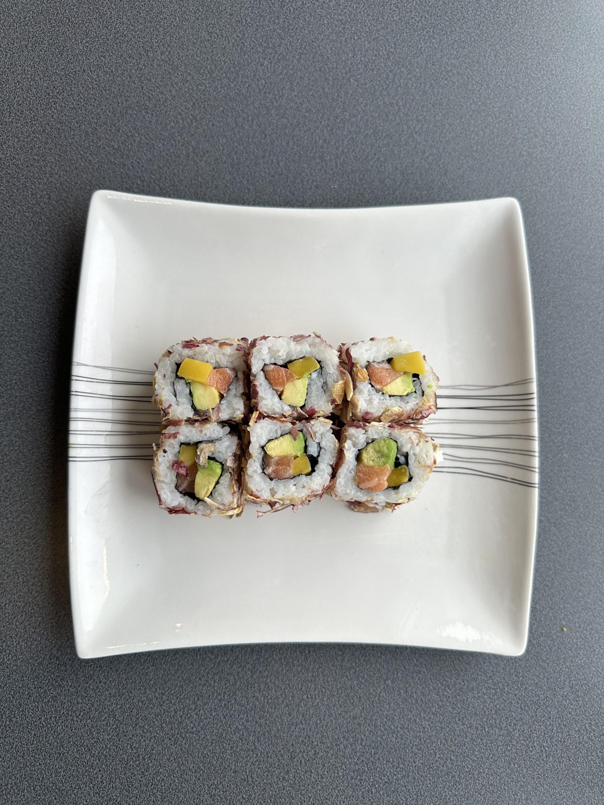 Saumon, avocat et mangue recouvert d’une feuille d’algue d’échalote séchée.