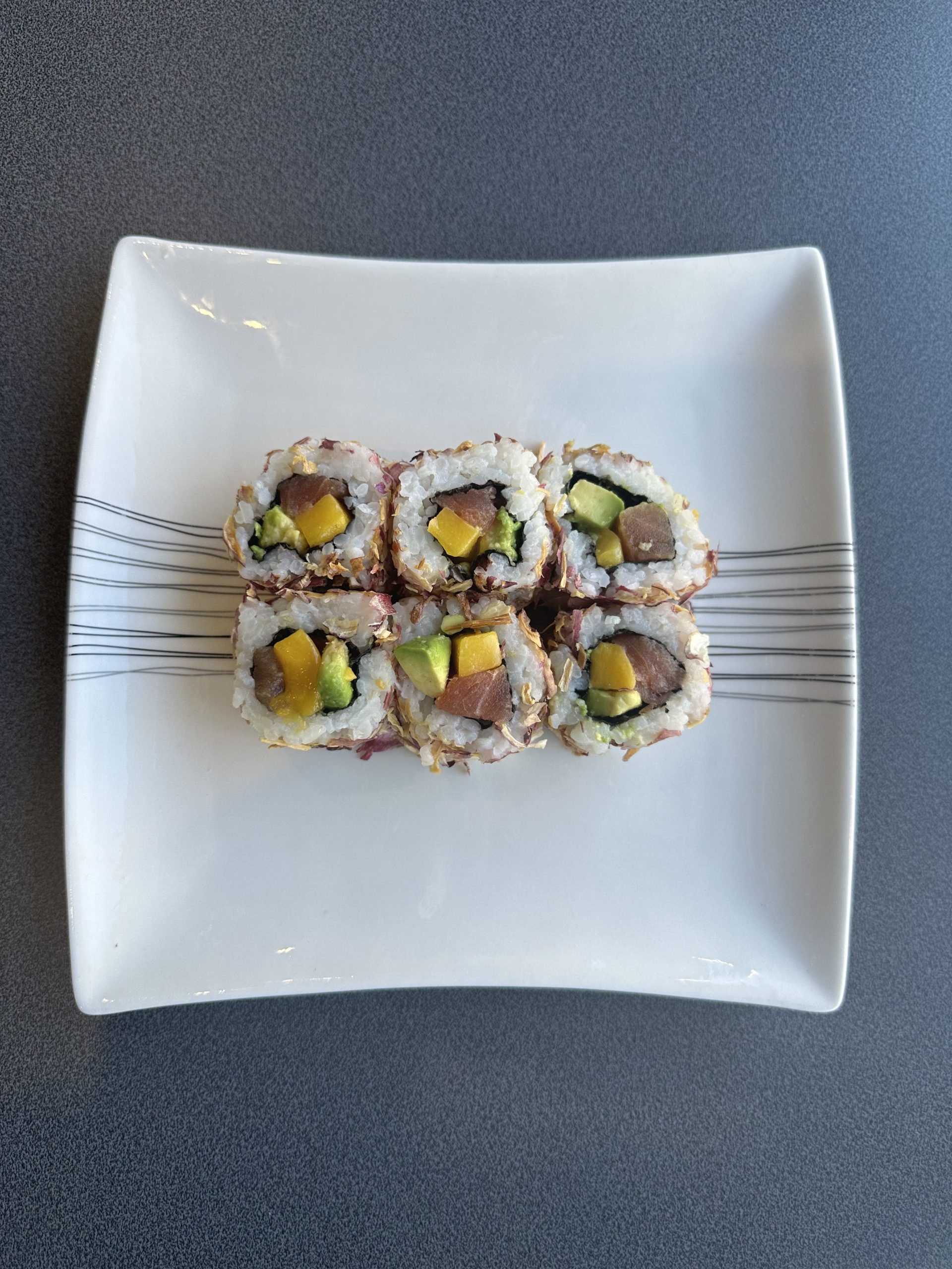 Thon, avocat et mangue recouvert d’une feuille d’algue d’échalote séchée.